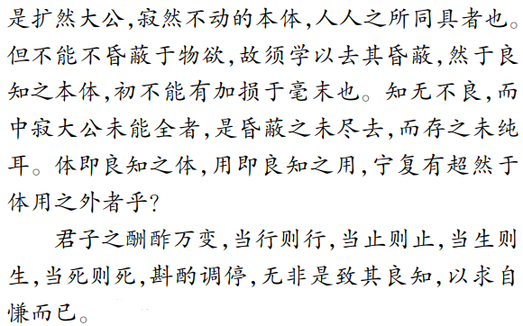 关于王阳明对“慎独”“诚意”传统的阐发,其实他的整个《传习录》可以说就是围绕这一传统展开的;而其所论的圣贤追求功夫也都是以“慎独”“诚意”为核心的。因为在确立了“圣人之道,吾性自足”的基础上,儒家圣贤追求最重要的资源与动力也就只能来自个体人生之内在了。正因为这一点,所以王阳明也就提出了一个“以复其心体之同然”为指向的“拔本塞源论”。在“拔本塞源论”中,王阳明首先提出了人人所同当然也首先是作为圣人之本心的“心体之同然”: