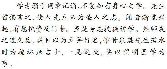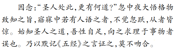 这说明,自从其形成“读书学圣贤”的志向,王阳明是真正将其“学圣贤”的志向贯彻于其人生之始终的。当然反过来看,也可以说当其形成“读书学圣贤”的志向时,也就已经形成了贯彻其一生的志向。