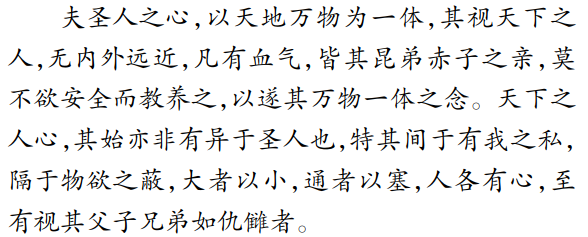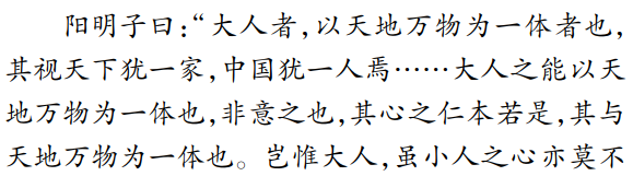 作为个体人生的主体精神,“良知”与“他人”、与“草木瓦石”的关系也就使阳明心学显现出一种“天地万物一体之仁”的精神,而这种主体精神也就充分表现在作为其一生追求的《大学问》中。当然在这里,所谓个体的主体精神仍然是其最基本的出发点: