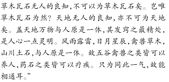 作为心学家,面对弟子关于草木瓦石是否有“人的良知”之问,按理说,这本来是从“良知”之“有无”的角度问人与草木瓦石之别,也应当是弘扬良知为人所独有的一个最佳机会,但王阳明这里却并没有陶醉于人的良知之“生天生地,成鬼成帝”的功能(当然,王阳明也不否认良知的这一作用,所以就认为“天地无人的良知,亦不可为天地矣”)。王阳明这里虽然是以良知突出了人与草木瓦石之别,并且认为“人的良知,就是草木瓦石的良知”,但即使是人的良知,其作用的发挥也仍然是建立在“天地万物与人原是一体……故五谷禽兽之类皆可以养人,药石之类皆可以疗疾。只为同此一气,故能相通”之基础上的。因而,王阳明关于良知与草木瓦石关系的这一阐发,既没有贬低人、贬低良知而使其等同于草木瓦石,同时也没有漠视草木瓦石的作用,反而通过“同此一气”的基础,进而实现“天地万物与人原是一体”的关系,这就使良知与草木瓦石乃至整个世界完全成为一种多元与多层共存的关系了。