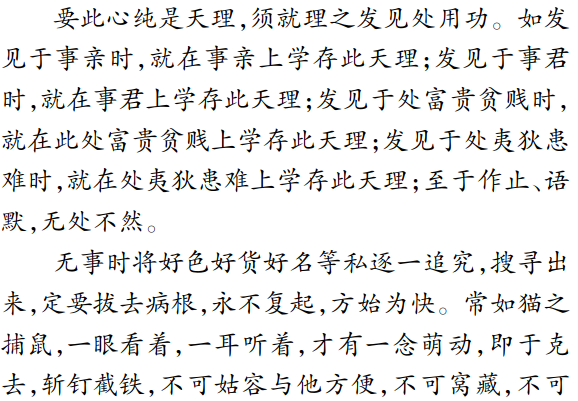 正因为王阳明准确揭示了明代社会风气所以形成的理论根源与现实成因,所以其对“身心之学”的倡导也就主要针对这种现象而发,而王阳明的对治措施也主要表现为两层:其一,即以“天理”彻底贯彻于人之心性,从理论上而言,这就主要表现为“心之体,性也,性即理也”;其二,则是通过其“身心之学”之“行著”“习察”规定的两面贯通与一时并到特征,从而要求必须将主体所自觉的“天理”贯彻于自己的日用伦常之中、贯彻于知行合一之间。否则的话,也就是“被私欲隔断,不是知行的本体了”。