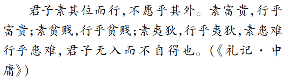 这里的“素其位”,就是安于自己的人生职分之意;至于所谓“素富贵”、“素贫贱”、“素夷狄”以及“素患难”等等,其实也都是就君子的各种人生际遇而言的。正因为安于自己的职分,不虚伪、不做作、不耍滑、不溜奸,所以无论是“富贵”还是“贫贱”、是“夷狄”还是“患难”,君子也都可以始终持守一种“自得”的心态。