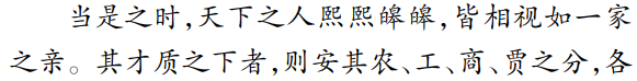 但是,这里要必须指出的是,阳明的“慎独”“诚意”功夫并不是西方基督教的“失乐园”“复乐园”之类的宗教创世神话,而是紧扣着其所生存的社会现实的,也是紧扣每一位国人都可以理解、也可以想象的生存现实的。比如王阳明对一直作为儒家之精神“原乡”——“三代”的如下描述: