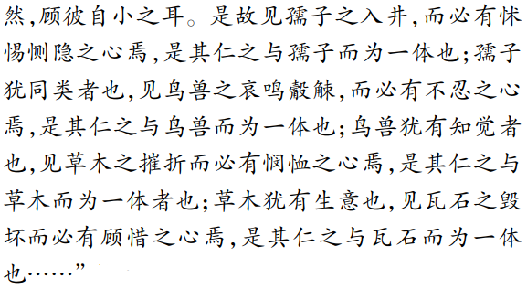 在这里,作为人之为人的“恻隐之心”仍然是阳明心学不可移易的基本出发点,但却绝不限于个体之“我”的层面,而是通过“充其恻隐之心,而仁不可胜用”的方式,从而达到“天下犹一家,中国犹一人焉”。至于其具体的实现次第,也就是扩充其恻隐之心“与孺子而为一体”,进而“与鸟兽而为一体”,最后以至于“与草木而为一体者也”“与瓦石而为一体也”。显然,作为个体主体,恻隐之心固然是其最基本的出发点,但恻隐之心之是否彰显、是否能够真正见之于真诚实意之行,则又首先决定于我们每一个个体的“慎独”“诚意”功夫,只有在“慎独”“诚意”的基础上,才能有恻隐之心的彰显与实现。从这个角度说,则王阳明的“慎独”“诚意”追求,就是其世界的基本出发点,也是其成己、成人与成物追求——儒家“万物一体之仁世界”的基本出发点。