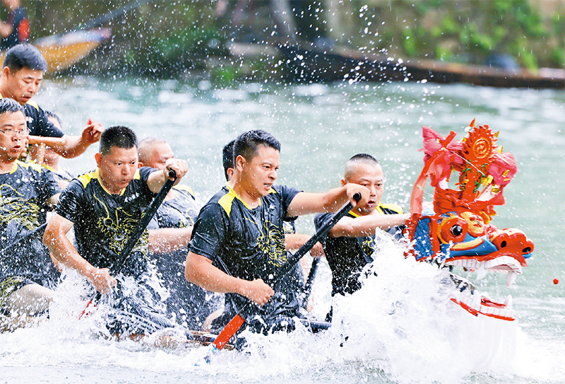 端午节是中华民族重要的传统节日,也是传承中华优秀传统文化的重要载体。图为2024年6月10日,浙江杭州西溪国家湿地公园浪花飞溅,鼓点激昂,上演激动人心的端午传统项目“龙舟胜会”。中新社发 周方玲/摄