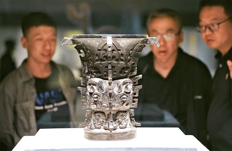 历史文化遗产承载着中华民族的基因和血脉。何尊是西周成王时期一个名叫“何”的宗室贵族所做的祭器,尊内底铸铭文中有“宅兹中国”四字,是“中国”一词最早的实物见证。图为2024年5月9日,游客在陕西宝鸡青铜器博物院内参观西周文物何尊。新华社记者 邵瑞/摄
