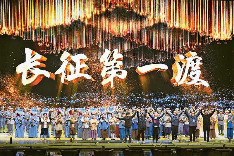 红军将士用生命和热血铸就的伟大长征精神,是革命文化的重要组成部分,具有穿越时空的强大感召力。2023年3月23日,大型红色文旅史诗《长征第一渡》在江西于都长征大剧院首演,观众在沉浸式体验中感受长征时期的峥嵘岁月。图为演出现场。新华社记者 万象/摄