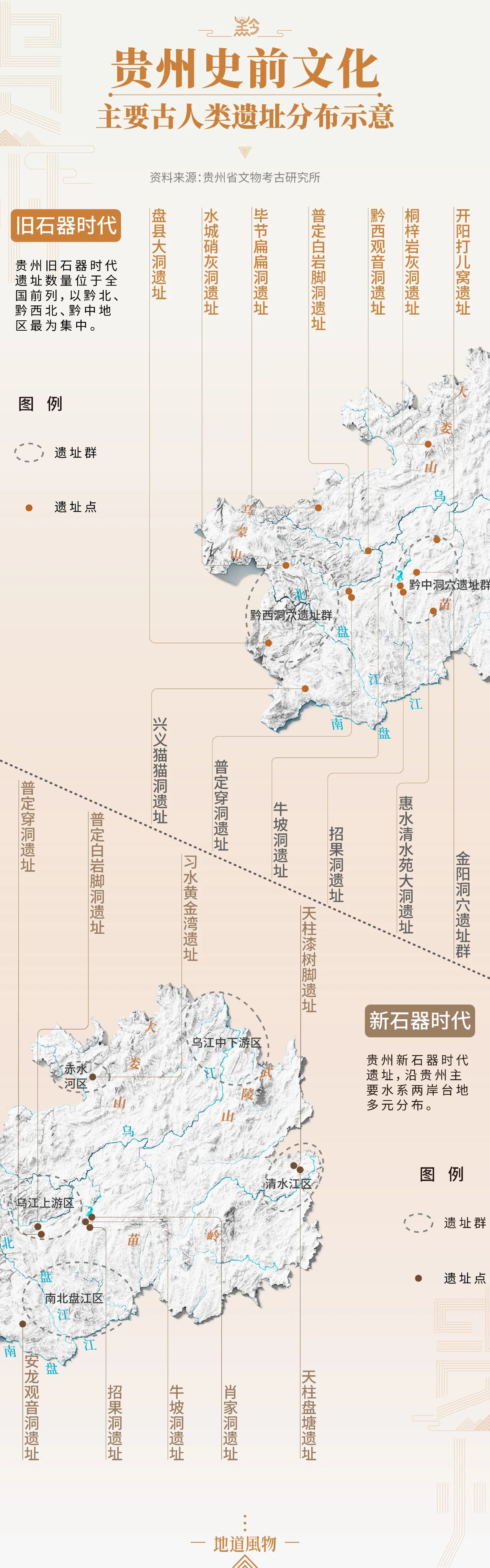 在时间尺度可达百万年之久的旧石器时代里,贵州的文化遗存在中国南方可称首屈一指,在全国也是极为丰富的省份之一,而在距今一万年左右的新石器时代,沿着河流与周边省域形成文化交流的一众遗址,又隐约呼应着今日贵州的多彩融合。