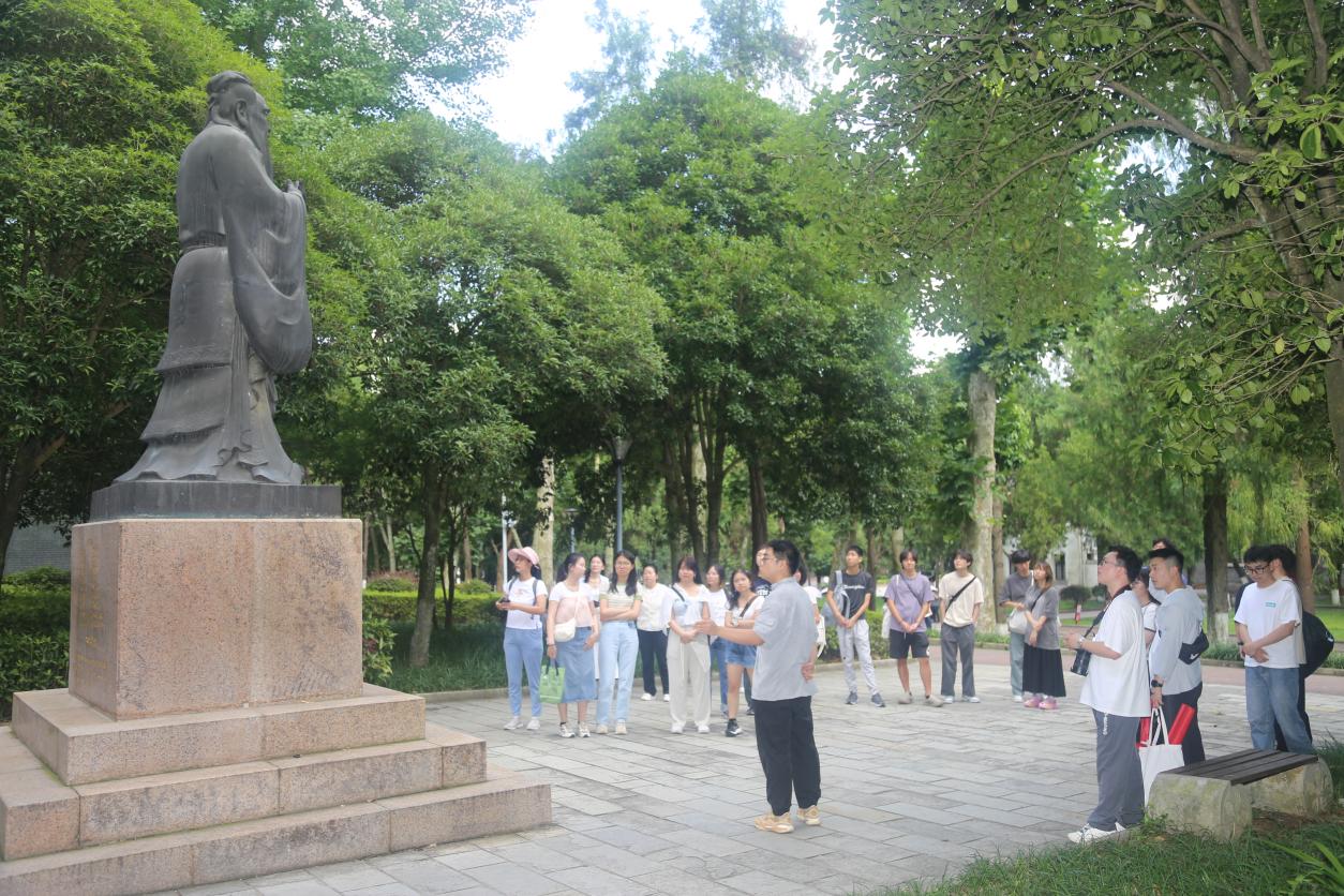 中国文化书院办公室人员带领客人参观书院孔子铜像、贵州教育文化鼻祖尹珍先生塑像、贵州大学前身“贵山书院”石刻,介绍书院勉学堂、励道楼、合一亭、涵远读书楼、仁文厅等处文化设施所蕴含的中国文化元素。