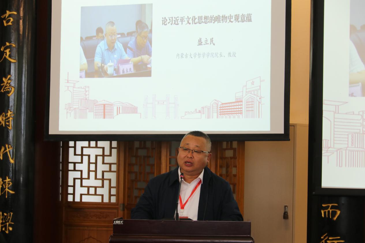 内蒙古大学哲学学院院长盛立民教授以《论习近平文化思想的唯物史观意蕴》为题,将习近平文化思想系统概括为“六论”:基于实践的时代语境的文化生存论、强调社会意识反作用于社会存在的文化价值论、体现“两个结合”的文脉延续的文化传承论、坚持人民群众主体地位的文化主体论、关乎意识形态主导权的文化安全论、以及推动创造性转化与创新性发展的文化创新论,并系统阐述了它们与唯物史观的内在契合。