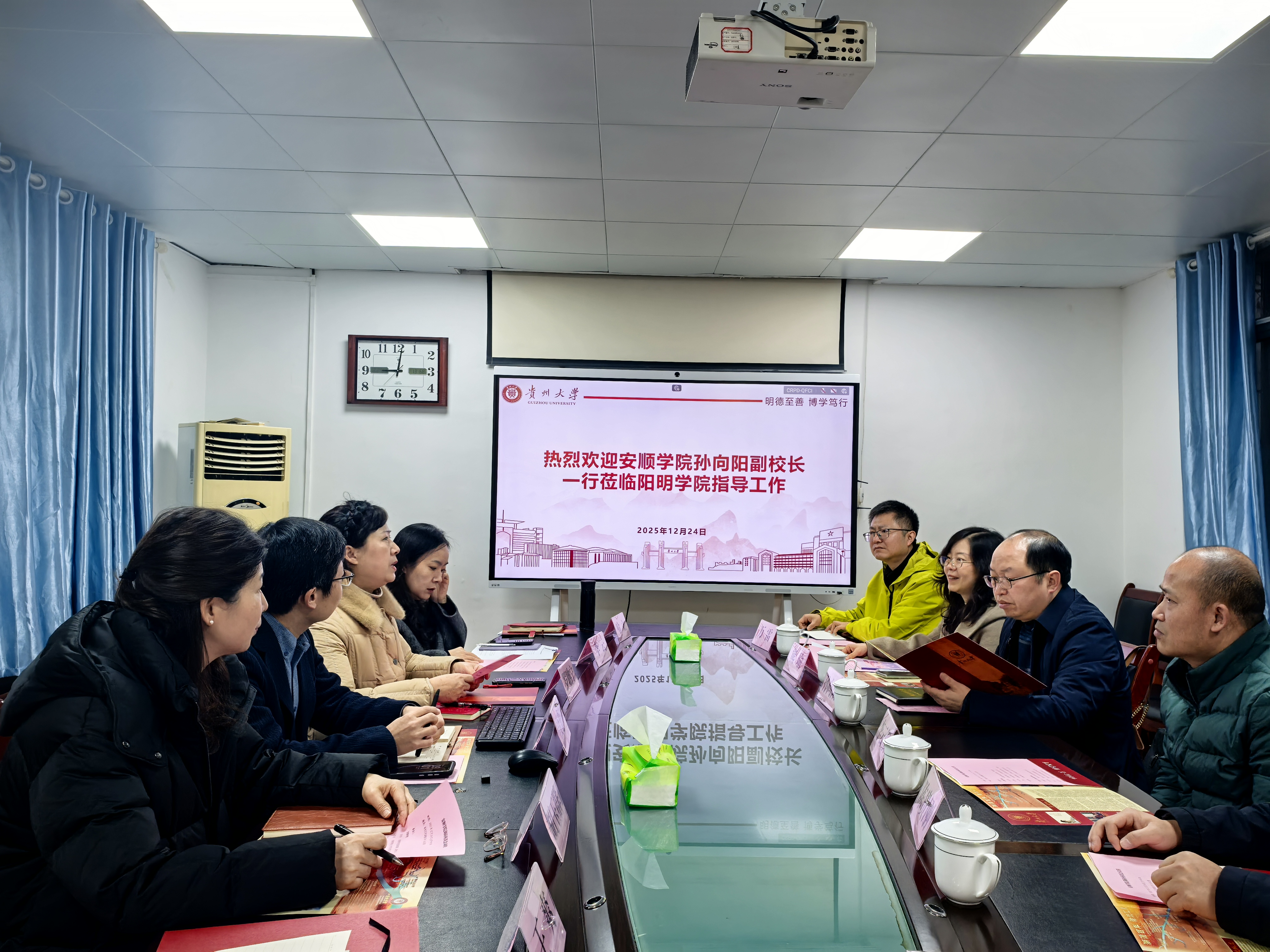 2025年12月24日上午,安顺学院党委常委、副校长孙向阳一行赴贵州大学阳明学院进行调研交流。调研座谈会在贵州大学南校区同渊楼201会议室举行,双方围绕“马院+书院”协同育人模式的构建与运行进行了深入探讨。
